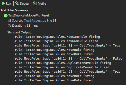 One aspect of the game domain is clear enough – the 3×3 grid. I created class Grid with an array with three rows and three columns. Less obvious is the support for the concept of three cells “in a row”. I created a Line class with three cells. I chose the name “Line” rather than “Row” to avoid confusion with the use of the word “row” to mean a horizontal set of cells. I also have a Move object to capture a player’s move and a GameStage object to capture the current state of the game, whether starting, active, or a win or a draw has taken place. All of these objects become facts in the NRules session.